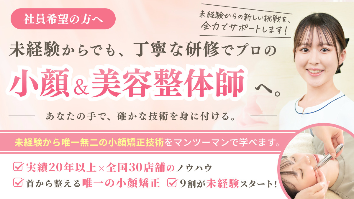 はじめまして。マネージャーの山下です。 私たちのサロンは、『痛くない小顔矯正』というオリジナルテクニックで、お顔の土台である第一頸椎から整える施術を行っております。 その技術力は多くのお客様から信頼をいただき、「ここに来ると笑顔になれる」と愛されるサロンへと成長しました。 経験の有無に関係なく、研修で基礎からしっかり学べる環境が整っております。 マンツーマンで丁寧に教えるので、未経験からでも“手に職”をつけて自信を持ってデビューできます。 また、私たちが大切にしているのは「愛される関係」です。 会社がスタッフを想い、スタッフがお客様を想い、お客様が施術者を想ってくださる。 そんなあたたかい循環の中で、みんなが笑顔で働いています。 笑顔のあふれるサロンで、お客様をきれいにしながら 自分自身も輝いていく―。 あなたの想いを、ぜひここでかたちにしてみませんか?