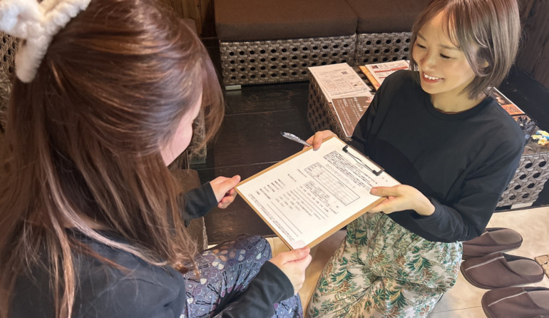 予約のお客様が来店されましたら、笑顔でお迎えします。 カウンセリングシートによりお客様のご希望などを聞き取りしながら、丁寧に施術内容をご説明します。 施術を開始します。 施術が終了しましたら、お客様にお茶をお出しして、少しの時間くつろいでいただきます。 お会計し、お見送りします。 次のお客様のベッドメイキングをします。