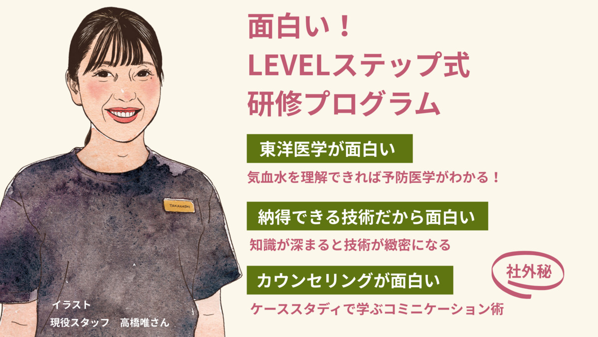 身に付けた技術でお客様を笑顔にするお仕事です! ■施術メニュー 健康と美容に関するセラピー 足・骨盤・ヘッド・デコルテ・オイル・フェイシャル骨気 ■施術場所 直営サロン フットセラピー/アジアンハーブス 東京・横浜・川崎・千葉・名古屋・京都・大阪・神戸・福岡 ■研修プログラム LEVEL 1 足つぼと骨盤 LEVEL 2 背面兪穴と呼吸筋 LEVEL 3 首とヘッドスパ LEVEL 4 オイルトリートメント(背面) LEVEL 5 オイルトリートメント(前面・腹部) LEVEL 6 デコルテトリートメント(胸部) LEVEL 7 骨気(頭蓋骨矯正・デトックスフェイシャル) LEVEL8 オーダーメイド カスタマイズ施術 ■知識・カウンセリング STEP 1 要望を引き出すカウンセリング法 STEP 2 施術で大切な体の知識 STEP 3 バランスを整える東洋医学の知識 STEP 4 指名学・NGキーワード