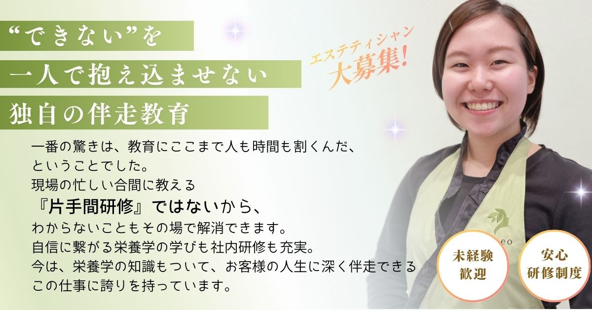 正直、「自分にできるのかな」という不安が一番大きかったです。 エステ未経験で、プロという特殊にも感じる新しい環境に飛び込むことに迷いがありました。 でもmyneoは、 「最初から完璧じゃなくていい」「ちゃんと育てるから大丈夫」 と何度も言ってもらえて、安心してスタートできました。