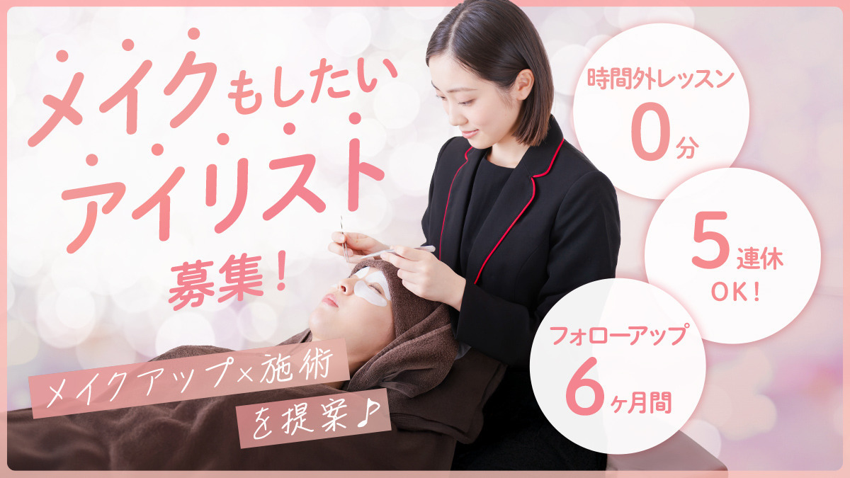 ∞∞━━━━━━∞∞ 具体的な仕事内容 ∞∞━━━━━━∞∞ 目元施術+メイクアップで、お客様の理想の印象を引き出すお仕事です。 ■カウンセリング └「なりたいお顔」をヒアリングします ■施術(まつげエクステンション、眉カット&デザイン) └「完全予約制&マンツーマン施術」 ■メイクアップ&アドバイス ■フロント対応、電話対応 ■予約業務、発注業務、在庫管理 ■クレンリネス、開店・閉店業務 ■お客様のニーズに沿った製品のご提案、販売(※ノルマなし) カウンセリングは「どんな印象に見せたいか?」から始まります。 服装や職業、日常の過ごし方も踏まえたヒアリングで、その方のライフスタイルに寄り添ったトータルビューティー提案を行います。 -- ・業務内容の変更範囲:会社の定める業務 ・就業場所変更の範囲:ご自宅から通勤可能な範囲内で決定いたします