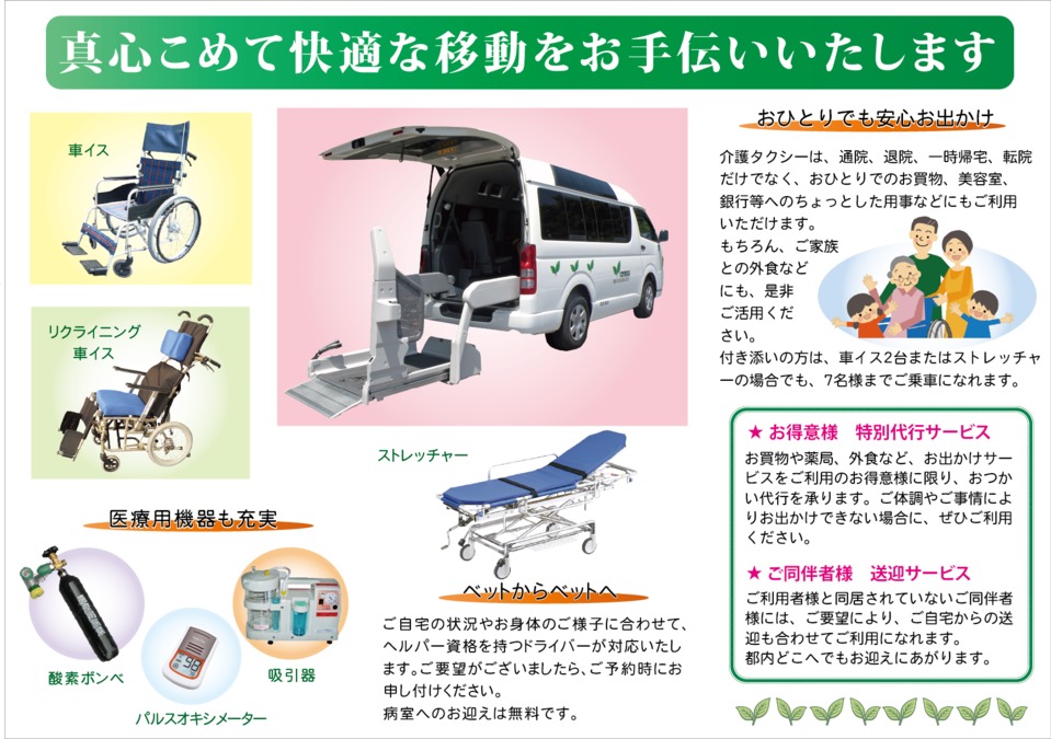 - 介護タクシー(福祉車両)業務全般 ・ご高齢者や障がい者を、車椅子等を使用して病院等への移送業務 ・ご利用者様はおもに、病院からの転院と退院、ご自宅・施設等からの通院 ※福祉車両は駐車禁止除外指定車両を使用