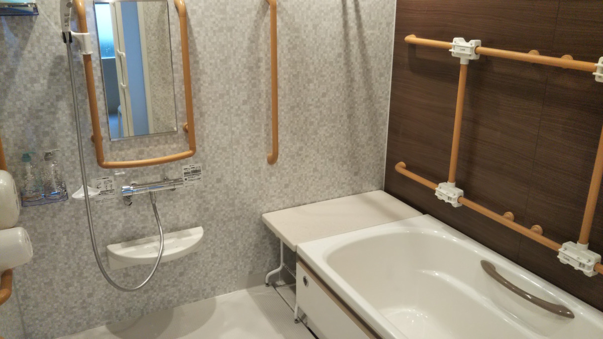 ・一般浴:浴室内および浴槽周囲に多数の手すりを設置。立位保持、方向転換、浴槽跨ぎ動作に対応。