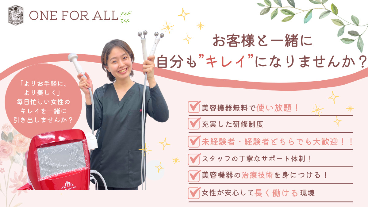 - ・お身体のお悩み、理想のヒアリング ・新式の痩身マシンを使ったボディ・フェイシャルの施術 ・お客様のお肌やお身体に必要なホームケアのご提案 がメインのお仕事となります。 本当にいい商品なので「まずは使って実感してほしい!」という想いから、お客様に院内にて美容マシン・商品の無料体験イベントも行います。 一緒に商品の使い方、魅力を伝えるお伝いをしていただきます。 ※業務の変更の範囲:法人の定める範囲 ※就業の場所の変更の範囲:法人の定める範囲 但し本人と相談・合意の上で、異動が決定します