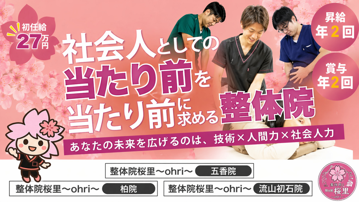 - ※整体院、接骨院、整形外科、リラクゼーション施設などで経験年数が合計「1年以上」ある方。 ※未経験不可 ※新卒不可 希望があれば社内評価制度により院長・副院長にキャリアアップ可。 役職に就かずに勤務していただくことも可能です!