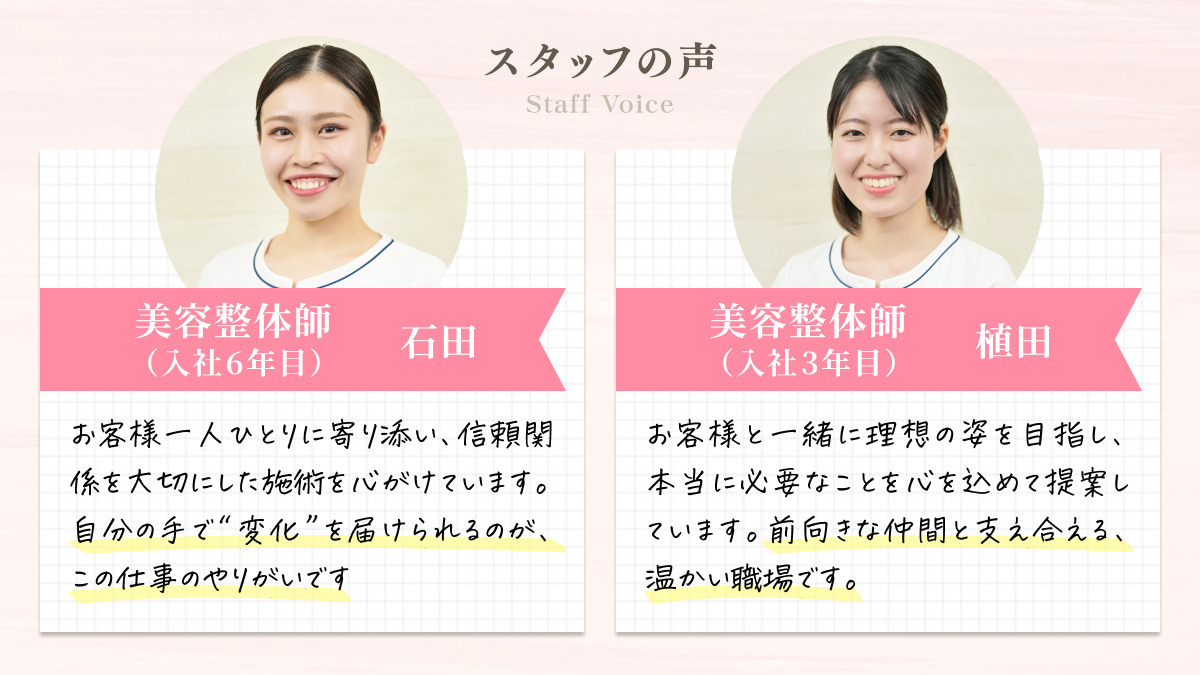 - 私たちは、「お客様の美と健康の理想を叶えること」を最も大切な仕事だと考えています。 だからこそ、梅田で“最も小顔になれるサロン”を目指し、そのための施術やメニューを磨き続けています。 ◆施術業務 ・シンメトリーオリジナル 独自の”小顔美矯正” ・更に小顔になるための骨盤美矯正(小顔は骨盤から始まる) ・顔筋筋トレ施術(EMS) ・小顔コルギ(韓国のコルギ技術) ・ラジオ波施術(小顔矯正と合わせて行うと更に小顔になる) ・ハーブピーリング(小顔だけでなく、美肌も目指す) ・レモンボトル(脂肪分解)&小顔施術(脂肪までアプローチして更に小顔に) ・メンズ専用小顔美矯正(女性向けとは異なる男性向けの施術方法) ・研修もすべて勤務時間内に実施します。 ◆カウンセリング・接客 ・お悩みや理想のヒアリング ・施術内容の説明、アフターケアの提案 ・お客様とのコミュニケーション ◆サロンワーク全般 ・受付、予約管理 ・簡単な事務作業 ・店内準備、清掃 ・チームでの店舗運営サポート ・社内ミーティングも全て勤務時間内に実施します。 技術だけでなく、接客力や人としての魅力も磨ける環境です。 未経験の方でも、研修を通じて基礎から丁寧に学べるので安心してスタートできます。