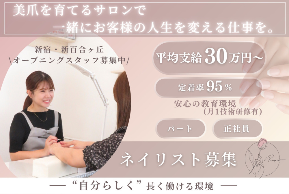 - ROCO 新百合ヶ丘店は2026年4月オープン予定♬ ROCOでは、パラジェルを中心とした美爪ケアをメインに、 お客様一人ひとりのライフスタイルやお悩みに合わせた施術を行っています。 爪の健康を第一に考え、爪育・巻き爪矯正・ケアメニューなども取り入れ、 “デザインだけでなく、美しい指先を育てる”ことを大切にしています。 カウンセリングでは、お客様の悩みや理想をじっくり伺い、 ライフスタイルに合わせた提案を行うため、リピーター様も多数。 1日の施術人数は4~6名ほどで、1人ひとりに丁寧に向き合える環境です。 また、希望者はまつ毛・エステなどの施術にも携わることができ、 トータルビューティーのスキルを身につけるチャンスもあります。 お客様との会話を楽しみながら、 「爪がきれいになって嬉しい!」という笑顔を間近で感じられる、やりがいのあるお仕事です。 無理な予約詰めや残業はなく、予約が入っていなければ早めの退勤もOK! チームで協力しながら、働きやすく成長できる環境を整えています(^ ^)