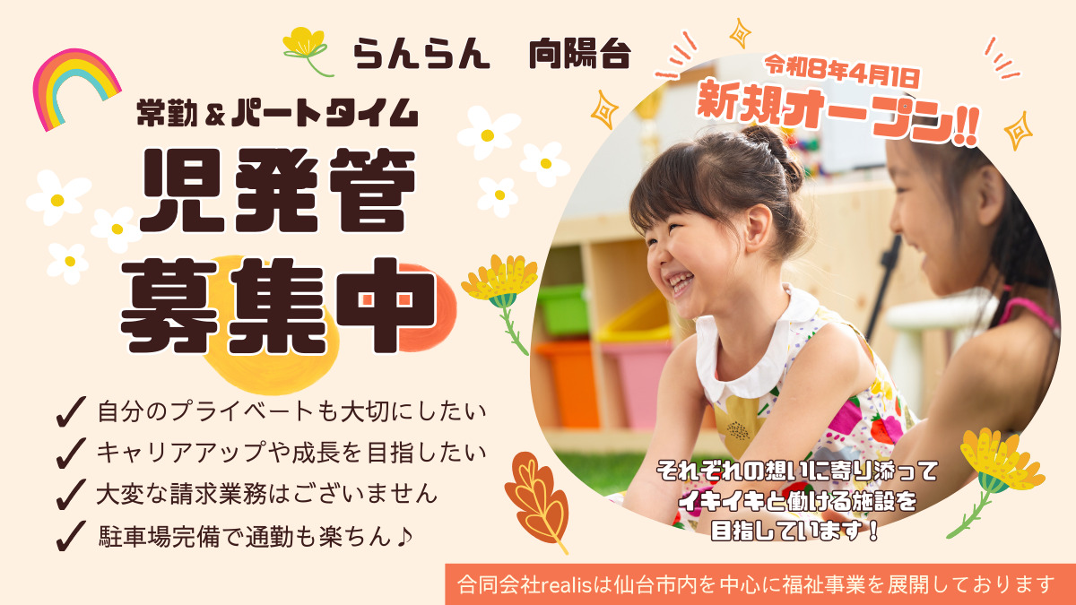 - 発達に特性のあるお子さまへの療育支援をお願いします 【 主な仕事内容 】 ・お子さま一人ひとりに合わせた療育支援 ・活動プログラムやイベントの企画・運営 ・宿題のサポートや学習プリントの準備 ・遊びや運動を通じた支援(体幹トレーニングやバランス遊びなど) ・活動記録の作成・教材準備 ・保護者とのコミュニケーション・サポート ・送迎業務(社用車使用) 従事すべき業務の変更:なし 就業場所の変更:あり(北仙台・富谷等)