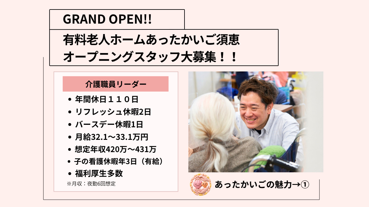 【本社所属| 施設横断型の介護職員】エリアプレイヤー募集!! 月給29万円(夜勤無し)・月給31.4万円(夜勤4回想定)/想定年収380万~432万円/年間休日110日(+リフレッシュ休暇2日・バースデー休暇1日)/賞与有り(65歳まで)/昇給有り/定年70歳/入職時『子の看護等休暇』3日付与(有給)/福利厚生多数/車通勤可/