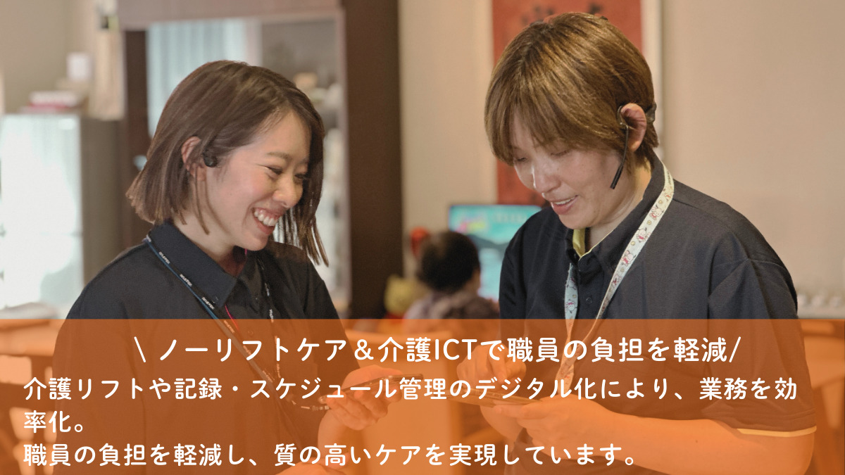 介護リフトの導入やケア記録、スケジュール管理のデジタル化の推進による業務効率化を図っており、職員の負担軽減と、高水準なケアを実現しています。