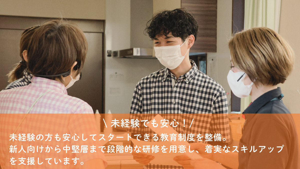 スタッフひとりひとりの成長をしっかりとサポートする研修とキャリアパス制度が整っています。 ・新人面談 毎月1回開催 ・育成ミーティング 毎月1回開催 ・新任者研修(介護未経験向け) ・中堅者研修 ・外部研修