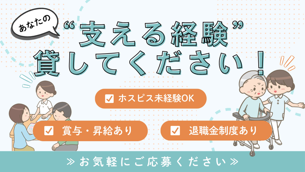 ホスピス住宅内の訪問介護事業所における介護業務をお任せします。 ・訪問介護 ・生活支援 【入浴介助】清潔ケア、更衣介助、洗髪、洗顔、部分浴、整容、浴室への移動介助 【食事介助】摂取動作介助、声掛け、見守り、配膳・下膳 【排泄介助】おむつ介助、見守り、トイレ誘導 【生活援助】室内清掃、環境整備、洗濯 ・ご入居者やご家族への生活上のアドバイス、精神的サポート <1日の流れ> 7:00~9:00 夜勤より情報共有、モーニングケア 9:00~11:00 入浴介助、生活支援 11:00~12:00 昼休憩 12:00~14:00 食事介助、清潔ケア 14:00~14:30 全体カンファレンス 14:30~15:30 おむつ交換、生活支援 15:30~16:00 申し送り、書類整理 ■遅出 11:30~14:00 情報共有、食事介助 14:00~14:30 全体カンファレンス 14:30~15:30 休憩 15:30~17:30 入浴介助、生活支援 17:30~18:00 申し送り 18:00~20:00 食事介助、イブニングケア 20:00~20:00 書類整理、申し送り ・業務の変更なし ・就業場所の変更なし