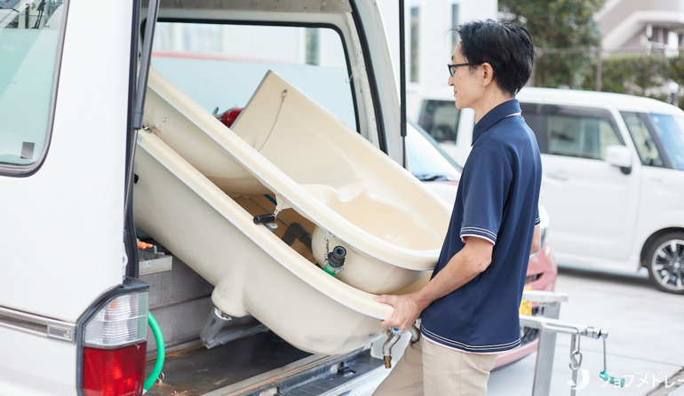 1件あたりの訪問時間はおよそ45分ほどです。 利用者さまの自宅へ訪問したら、まずは15分ほどで浴槽搬入・入浴準備をします。 スタッフがお身体を洗い、10分ほど入浴してもらいます。(利用者さまの状況に応じて、部分浴や清拭に切り替える場合もあります。) お身体を拭き、着衣介助・バイタルチェックを行い、1件目の入浴サービス終了です* 片付けをし、次の利用者さまの自宅へ移動します。