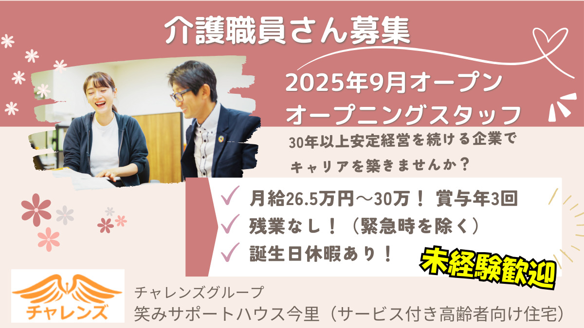 ☆サービス付き高齢者向け住宅が2025年9月にオープンしました☆オープニングスタッフ募集☆30年以上に渡り安定経営えを続け、10事業所以上展開するチャレンズグループにて「介護士」としてのキャリアを築きませんか?当社だからこその、待遇・サポート体制が整っています♪