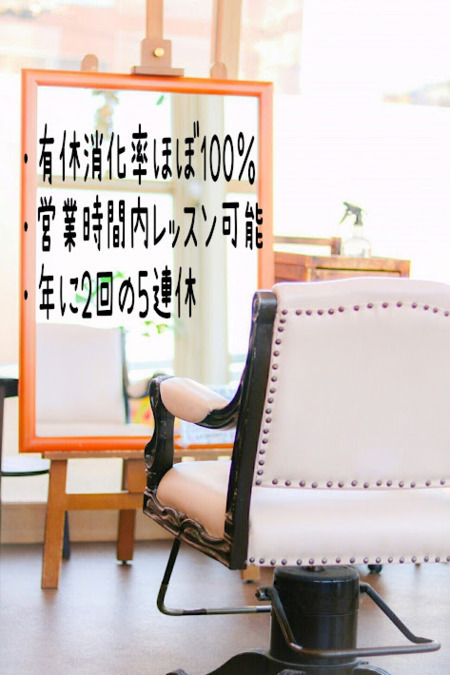 定休日 :毎週月曜日サロン定休日 (週休2日制) 営業時間:9:00~21:00 (シフト制 9:00~21:00の間で実働8時間 休憩60分)