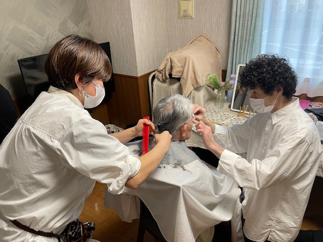 玄関前に集合し、荷物の搬入。 美容室の開店準備をします。 外の美容室に行くのと変わらない雰囲気づくりを心掛け、五感で楽しんでいただける工夫をしています。