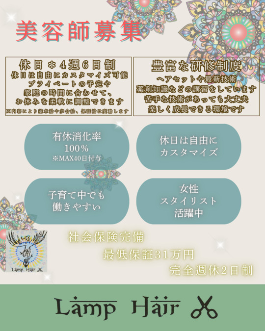 サロンの一般的な業務全般(ヘアメイク、ヘッドスパ、ヘアセットなど) ※ノルマなし ※客単価7000円以上、毎月の新規客数は100~200名 ※フルタイムパートとしての雇用になります 雇用期間の定め:なし 【LAMPHAIRはスタッフを大事にします!】 LAMPHAIRでは皆さんができるだけストレス無く平和に暮らせるようバックアップ致します。体調面や暮らし、家族、金銭的悩みなどにできる限りサポートしていきます。独立をお考えの方もぜひご相談ください。 職場環境として当店ではスタッフがお店で快適にすごせるための設備に注力しております。◯広いバックルームを完備しゆとりのあるパーソナルスペースがありますので、休憩時間もリラックスして自由にすごせます。◯トイレ→男、女、スタッフ用と3つあります。他大型の冷蔵庫、カメラ設備3台あります。◯スタッフ用駐車場完備 ◯賠償保険に加入していますので、万が一お客様との大きなトラブルが発生した際も安心です ★★【LAMPHAIRでレベルアップ☆】 LAMPHAIRで働くとより深い技術、知識と向き合うことになります。多くの方があまり自信がない状態で入社されますが、ほとんどの方が短期間で大幅にレベルアップできますので、半年もすると嘘のように自信に満ち溢れた接客ができるようになります。もちろんそのためのサポートはおまかせください♪当店はスタジオアリスとも提携を行い、ヘアセット、アレンジ技術も重視しています。ヘアセット技術以外でも新技術など定期的にスタッフの技術トレーニングも行っております。 ★★★【LAMPHAIRは高収入♪】 LAMPHAIRでは人件費比率を55%以上に設定していて、高水準の安定した給与をお支払い致します。賞与と有給(MAX40日)があり、社会保険も完備しております。昇給制もあるので、ほとんどのスタッフが毎年収入アップできています。その点ぜひ他社と比較してみてください。LAMPHAIRではがんばった分だけ確実に給与に反映されますし、その分高いモチベーションをもって働ける環境になっています。 保証給もあるので、既婚者や子供がいる方でも生活がとても安定します