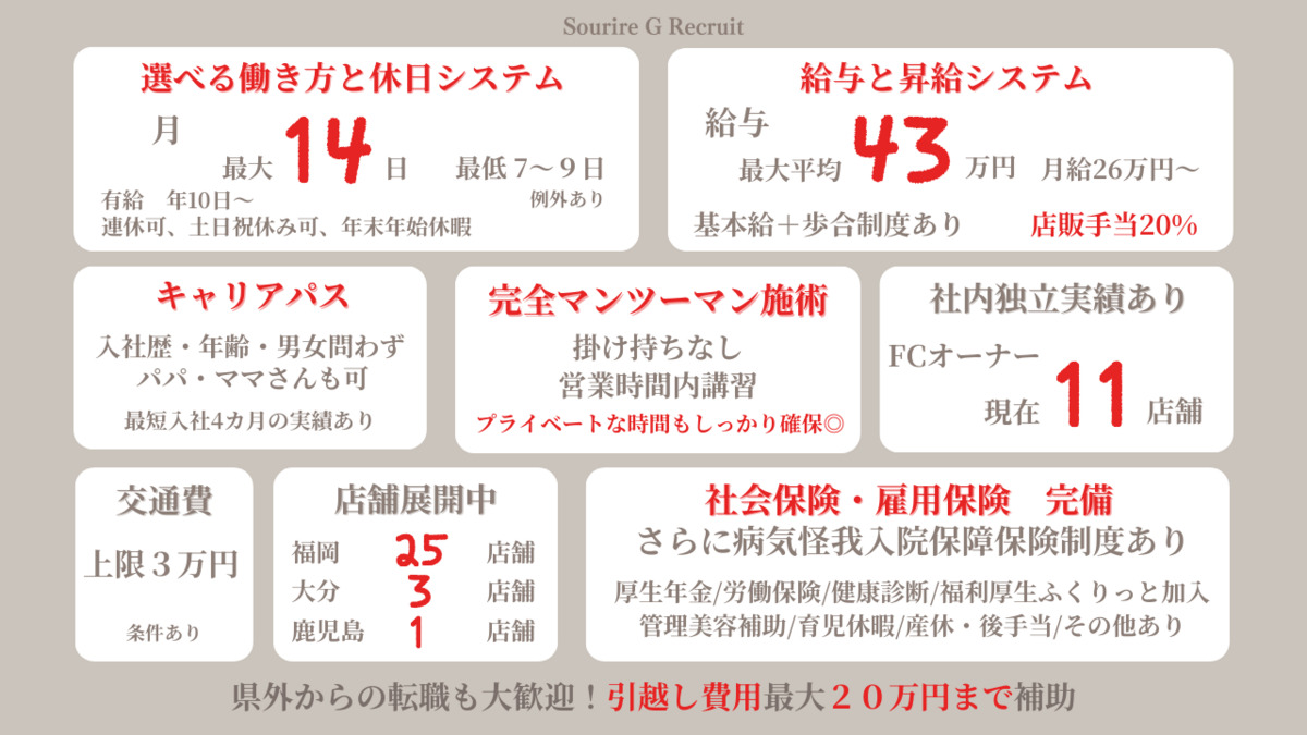 スーリールに入社できて本当に良かったです♪ 私は、マンツーマン施術・福利厚生の充実・給与体系が大分エリアでとても魅力的だったので応募させてもらいました。 入社して感じたことはお客様に喜んでもらえるサロンであるのと同時にスタッフが満足して働く事のできる環境なのを実感してます。 スーリールでは入社すると平等に入客のチャンスがあり、キャリアアップもできる環境があるので目標を持って働けることに感謝しながら成長していきたいです! 本部が福岡にあるのでマネージャーからの技術指導も定期的に行って頂き、常にアップデートされた新規集客の方法やSNSへの発信のアドバイスが受けることができるのでとても勉強できます♪ 私はまだスーリールで働かせてもらって期間は短いのですが、サロン見学させてもらった時から「このサロンで働きたい!」と心から思ったので、ぜひスーリールで一緒に働きましょう(^ ^)