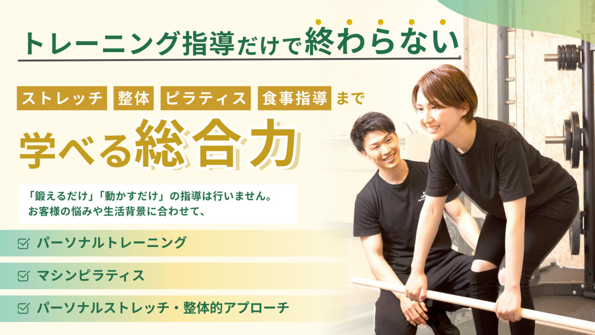 【業務内容】 〈パーソナルトレーナー〉 ・カウンセリング/体験トレーニング ⇒新規の方のカウンセリングから体験トレーニング、入会手続きまでを行って頂きます。 ・マンツーマンでのトレーニング指導・食事指導 ⇒ダイエット、ボディメイク、機能改善など、お客様のニーズに合わせたトレーニング指導を1セッション60分で行って頂きます。また、食事指導を希望されるお客様へはLINEを使った食事指導を実施して頂きます。 ・店舗雑務 ⇒開店作業から閉店作業まで、清掃等店舗を運営する上で必要な業務を行って頂きます。 無理な食事制限を一切行わず、科学的根拠をベースにした食事・運動指導を行います。 〈ピラティスインストラクター〉 ・カウンセリング/体験ピラティスレッスン ⇒新規の方のカウンセリングから体験ピラティスレッスン、入会手続きまでを行っていただきます。 ・マンツーマンでのピラティスレッスン ⇒姿勢改善やダイエット、運動不足解消などお客様のニーズに合わせたレッスンを1セッション30分又は50分で行っていただきます。 ・店舗業務 ⇒開店作業から閉店作業まで、清掃等店舗を運営する上で必要な業務を行っていただきます。 パーソナルトレーニングもピラティスも担当制のため、一人のお客様に長く寄り添った指導ができることが魅力です!