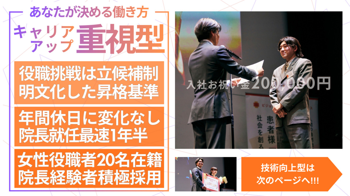 <キャリアアップ> 年間10店舗以上出店しており、院長などのポジションも多いため、キャリアアップのチャンスも豊富です! 院長などのマネジメント職だけでなく治療家としてのエキスパート職も選択でき、キャリアの選択肢も広い! <待遇・福利厚生> ・社会保険完備(雇用保険・労災保険・厚生年金・健康保険) ・健康診断有(年1回) ・産休育休(取得実績5名以上) ・年末年始休み ・有給休暇年10日以上(昨年実績取得率約95%) ・院長経験者は前職の給与を半年間保証する「キャリア採用制度」を用意しています。(適用条件アリ) ・引越費用一部負担