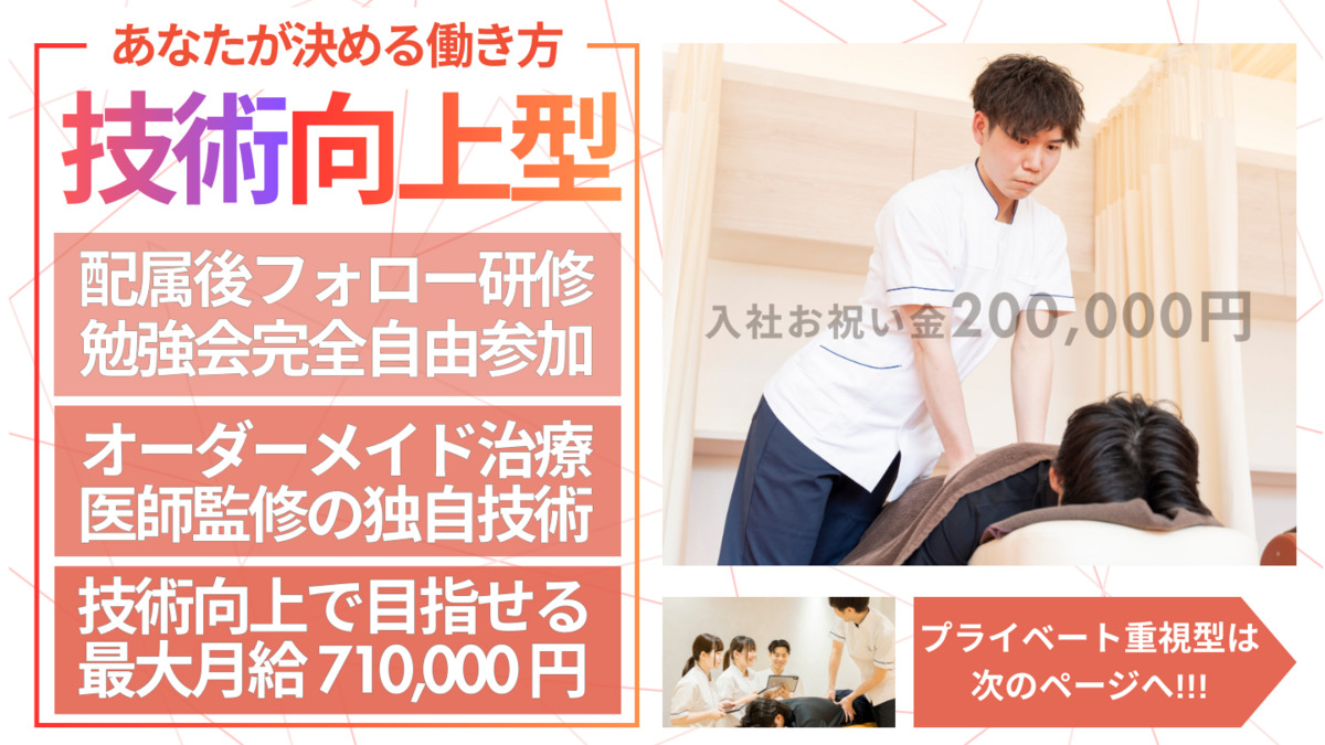手技治療を中心とした鍼灸整骨院業務 自社オリジナル全身矯正 トリガーポイント治療 ・マニュアルにとらわれず、患者様に合った施術を提供しています。 ・独自の手技による矯正治療があり、自費割合は80%を超えています。 ・技術だけでなく接遇等の患者様対応にもこだわりを持っています。 ・電子カルテやWeb予約など、システム導入により事務作業を効率化。目の前の患者様としっかり向き合える環境です。 ー・ー・ー・ー・ー・ー・ー・ー・ー・ー 【ぷらすの患者様との3つの約束】 1.初回から必ず効果を実感できる 患者様を「診る」スキルをはじめ、独自の技術で治療効果に自信があります。初回不満足の患者様には返金も行っています。 2.誰よりも患者様と向き合う ただ痛みをとるだけではなく、その患者様が本当に求めていることを叶えるために、症状ではなく人と向き合い治療します。 3.患者様ひとりひとりを特別扱い ぷらすに通いたい、何かあったらぷらすを頼りたい。と思っていただけるよう治療以外のコミュニケーションなども拘りぬいています。 ー・ー・ー・ー・ー・ー・ー・ー・ー・ー