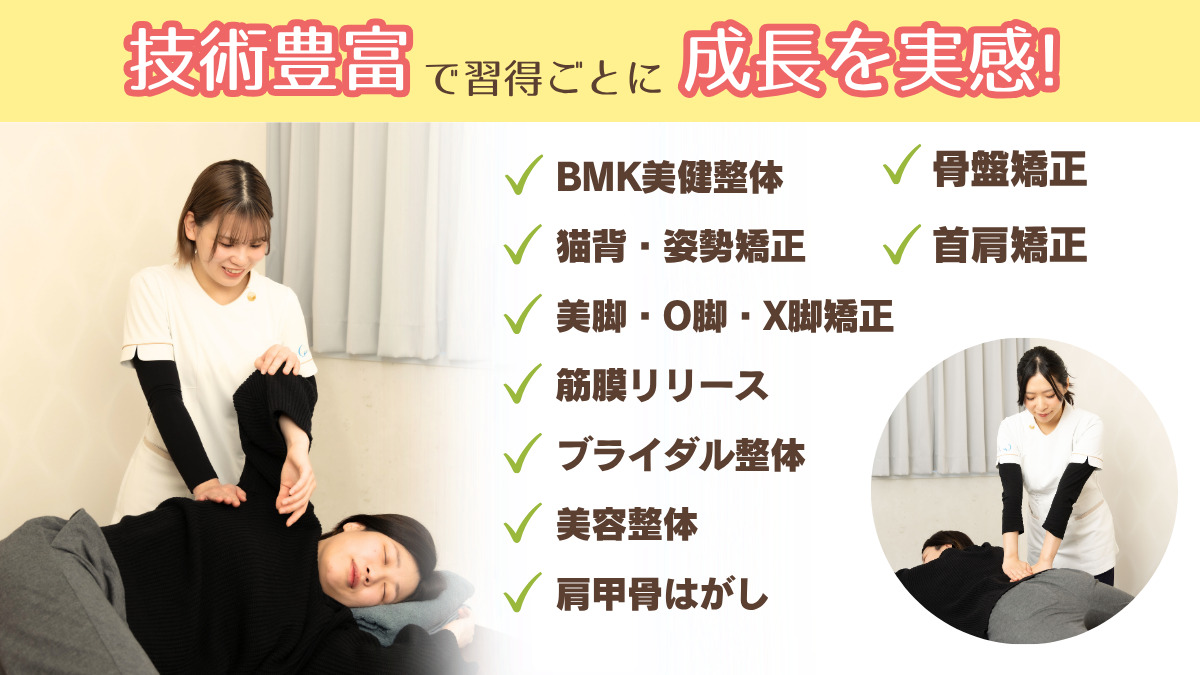 当社のスキル(キャリア)アップ 当社では 1.社会人としての人間力 2.1か月で習得・エビデンス取得の整体技術 3.原因を的確に分析する検査・問診力 この3つが学べます。 これらは一流の施術家としてなくてはならない必須のスキルになります。 当社はこれら3つのスキルを習得していただく育成マニュアルを作成しています。また、現場研修だけでなく、オンライン研修・Eラーニングなどサポート体制もしっかりしているので早ければ1か月で習得ができ、スキルを活かして仕事をすることができます。 <当社で学べる技術一覧> ・骨盤矯正 ・猫背矯正 ・小顔矯正 ・美脚矯正 ・産後骨盤矯正 ・頸肩矯正 他にも、勉強会や外部講師をお招きして研修を開催したり、スタッフの育成に力を入れています。