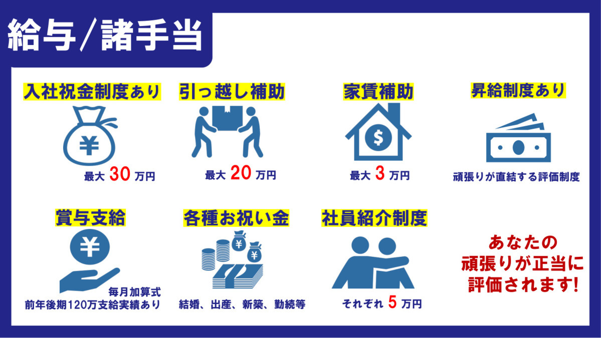 ◼︎ 家賃補助、引っ越し補助、各種手当・福利厚生充実