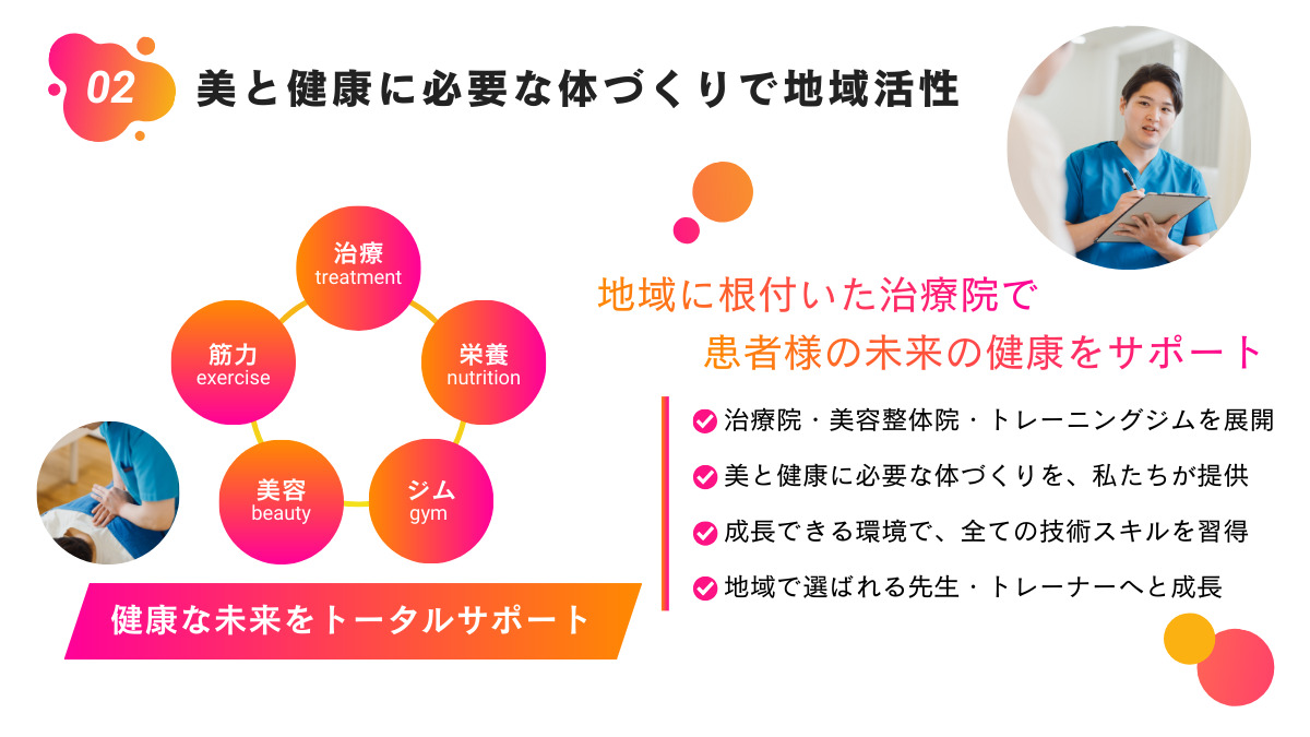 1. 骨盤矯正:患者様の骨盤のバランスを整え、日常生活で不快感や疲労を軽減し、快適な姿勢をサポートします。 身体の軸を整えることで、疲れにくい身体づくりを目指します。 2. 姿勢矯正:正しい姿勢の習慣化を支援し、肩こりや腰痛などの症状改善に貢献します。美しい姿勢は健康と美容にも繋がります。 3. 産後の骨盤矯正:出産後の身体の変化に対応し、骨盤の歪みや不調を改善します。ママの健康と幸せな育児生活をサポートします。 4. 美容整体:小顔整体、ダイエット痩身、ボディメイクなど、一人ひとりの美容目標に合わせた施術で、自信と美しさを追求します。 5. 栄養指導治療:バランスの取れた食事の提案し、健康な体を作るためのサポートを行います。食事からの美と健康を両立させます。 6. トレーニング治療:正しいトレーニングプログラムを提供し、筋力や体力の向上を目指します。健康的な身体作りを支援します。 ★患者様の日常生活にポジティブな影響を与えて、健康と美容を両立させるサポートを提供しています! ★構造学×運動学×栄養学の3つの視点からトータルアプローチを行います! ★美と健康に必要な体づくりをサポートし、なりたい姿へ導いていくお仕事です! 従事すべき業務の変更:なし 就業場所の変更:出店状況により同一県内エリアでの異動や出向がある場合があります