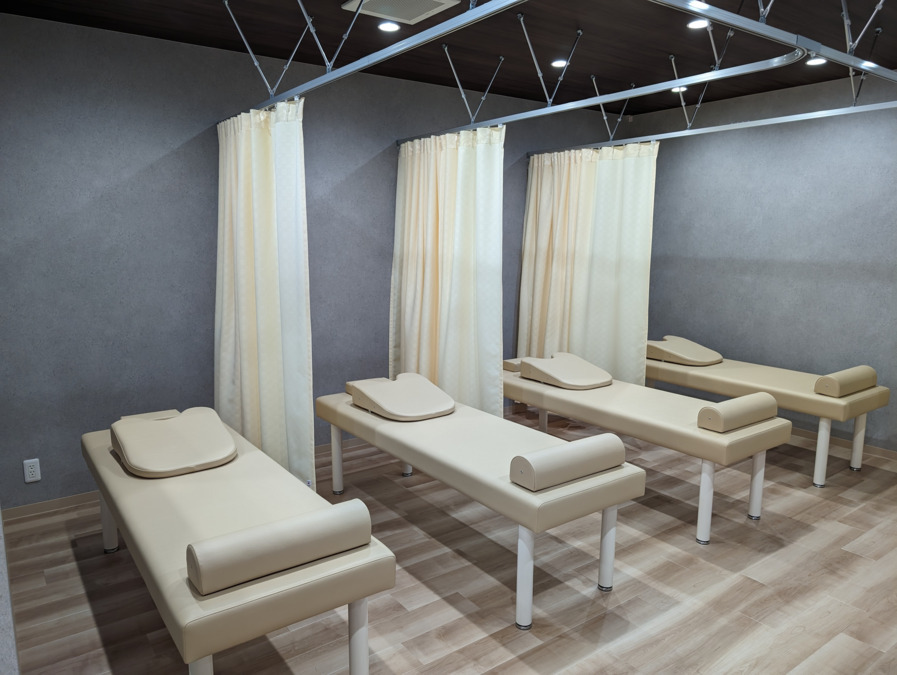施術内容はマッサージ・筋膜リリース・ストレッチ・骨格矯正・猫背矯正・鍼灸・美容鍼灸・EMS・テーピングなどがあります。