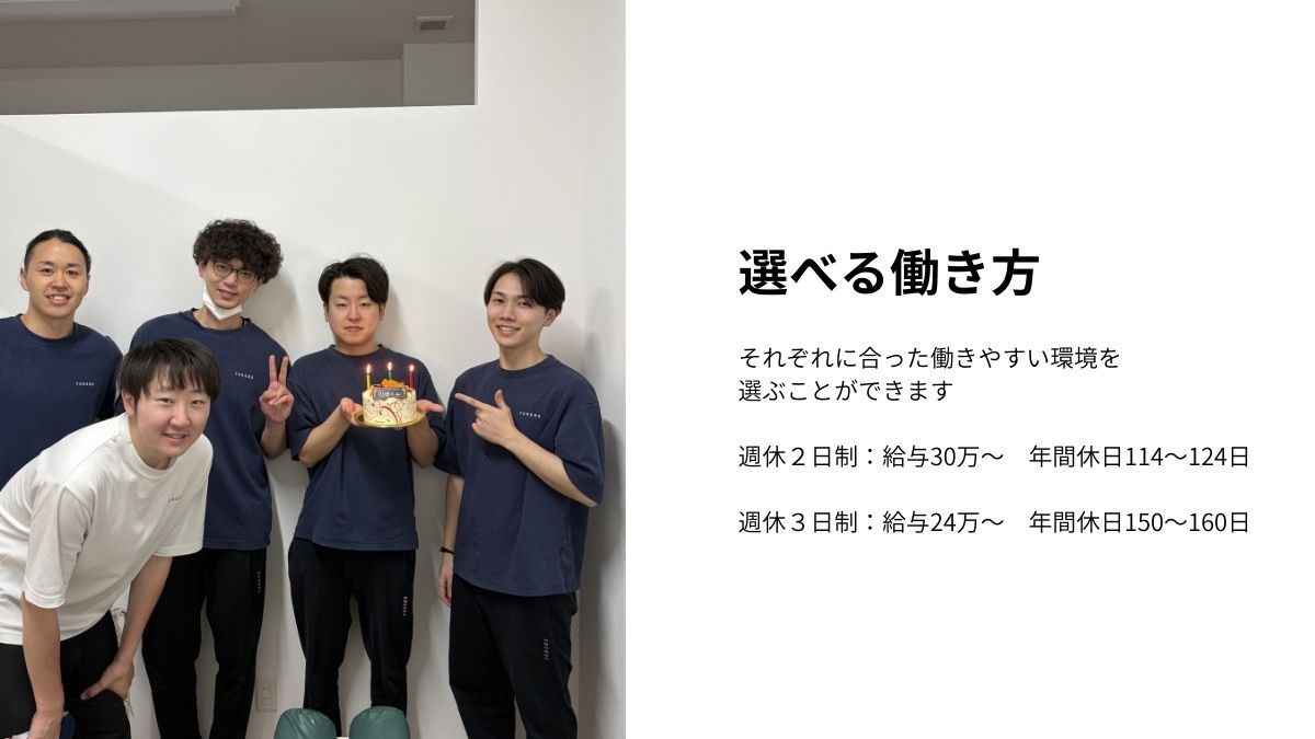 週休2日または週休3日(選択制) 有給取得推奨 年2回長期休暇(5連休可) 産休・育休制度あり