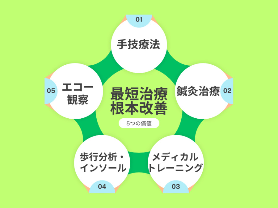 手技や鍼灸により痛みを改善させていくことはもちろん、最短治療かつ根本改善のために『セミパーソナルトレーニング』、100年歩ける身体づくりのために『AIを使った歩行分析』と『医療用インソール』、そして正確な状態の観察のために全員が使える『エコー観察』を、すべての患者様に提供。
