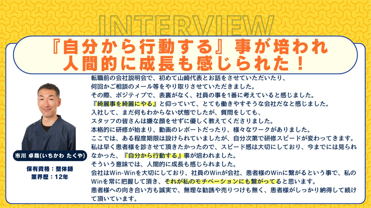 「整体師として“結果を出す力”と、“人を幸せにする力”を両立できる環境を作りたい」