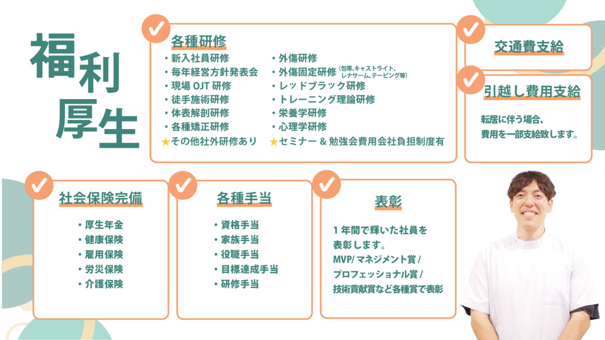 治療技術(外傷も障害性疾患も幅広く)を学べる環境、心理学を用いた自己理解、他者理解、接客、チームをより円滑にするコミュニケーションを学んで頂くカリキュラムをご用意しています。また、評価制度を基にした明確なキャリアプランがあります。努力次第で分院長、マネージャーも目指すこともできます。