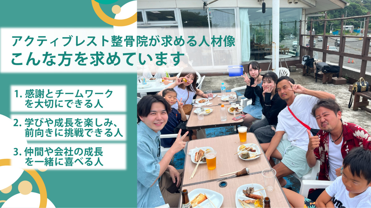 当院ではスタッフ全員が元気で明るい所が魅力の一つです。そのため、一般的にみなさんが思っている治療院とは違い、いつも笑い声で溢れているます。また、スタッフ同士の年齢も近いので、プライベートでも一緒に遊びに出かけたり、悩みがあれば打ち明けやすい環境も魅力の一つだと思います。