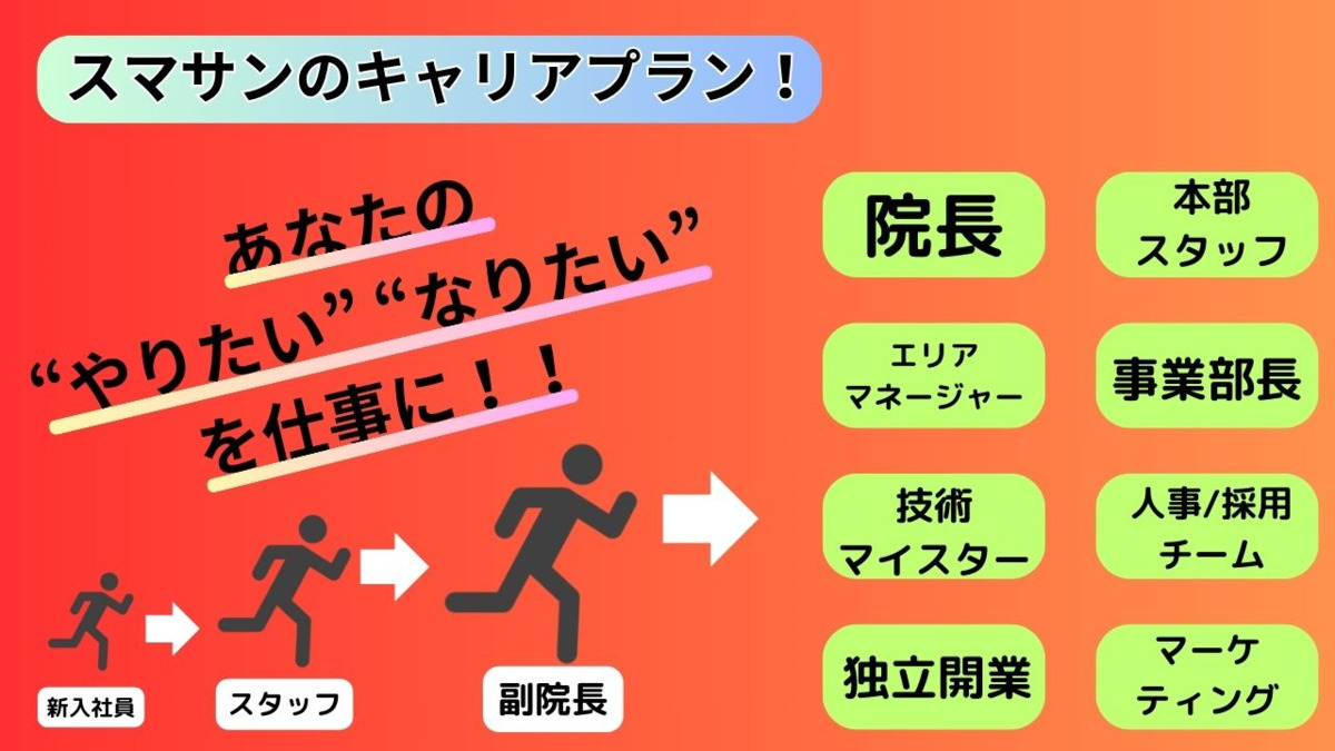 院長はもちろん、事業部長や研修の構築や講師、マーケティングなど本部スタッフへの道も!また役職を取らずに、臨床の最先端で患者様と向き合っていくのも可能です。