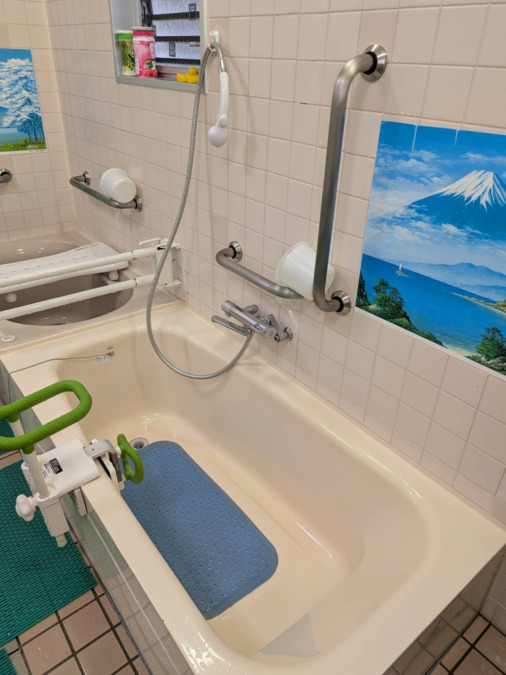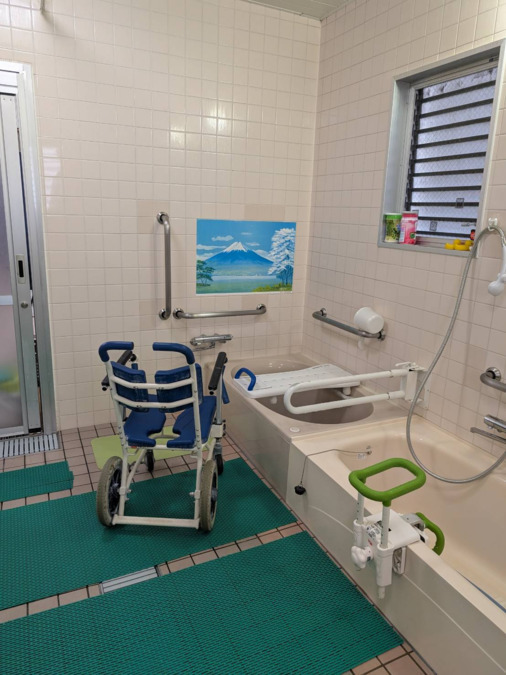 機能訓練指導員(作業療法士)と看護師が常駐しており、専門的な視点から利用者様を支えています。平行棒を用いた歩行訓練や段差昇降訓練などのリハビリに加え、爪切りや塗布薬の対応、体調変化の観察、急変時の看護対応まで行える体制を整えています。日常動作の維持・改善から健康管理まで、安心して通っていただける環境です。◆浴室の特徴◆