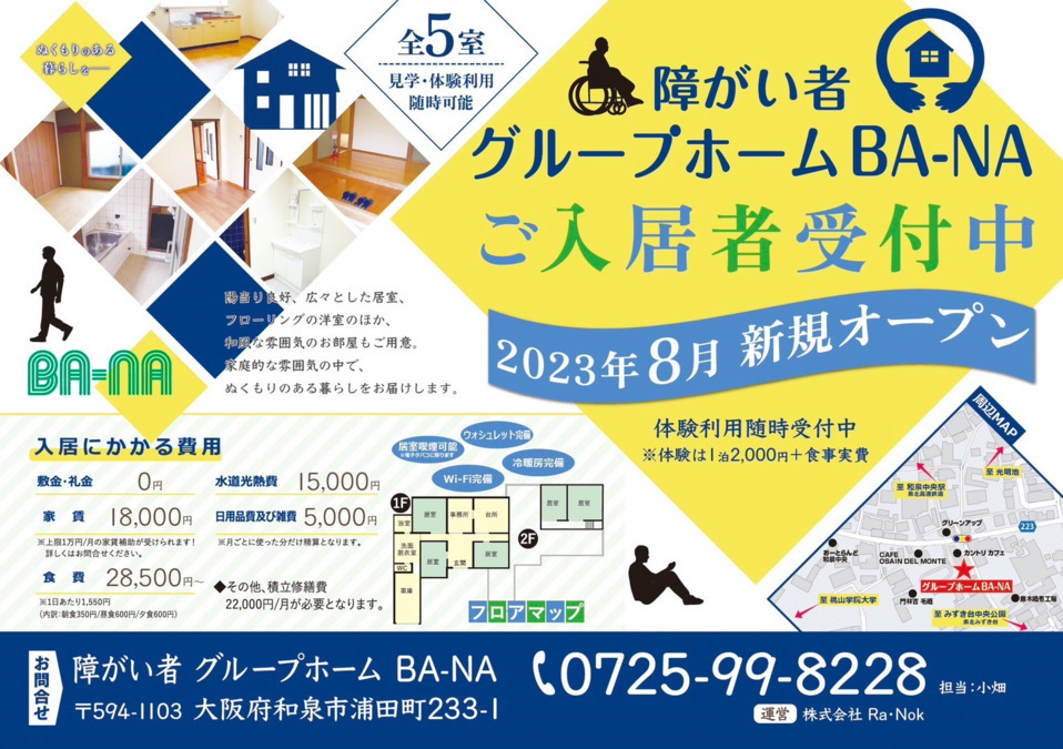 2023年8月1日オープンの『障がい者グループホームBA-NA※5室』での世話人or生活支援員のお仕事!!!』
