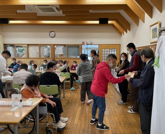 利用者さんに合わせた食事の形態や食器に注意し、厨房職員と連携しながら昼食の配膳を行います。昼食介助が必要な利用者さんには食事介助を、食後はブラッシング介助を行います。 食事量の把握、服薬なども確実に行います。各、作業班から分かれて支援を行うので利用者さん同士、職員との交流に花が咲きます。所庭、和室など自分の好き場所で好きに過ごしていただけるように職員は各役割に分かれて支援を行います。