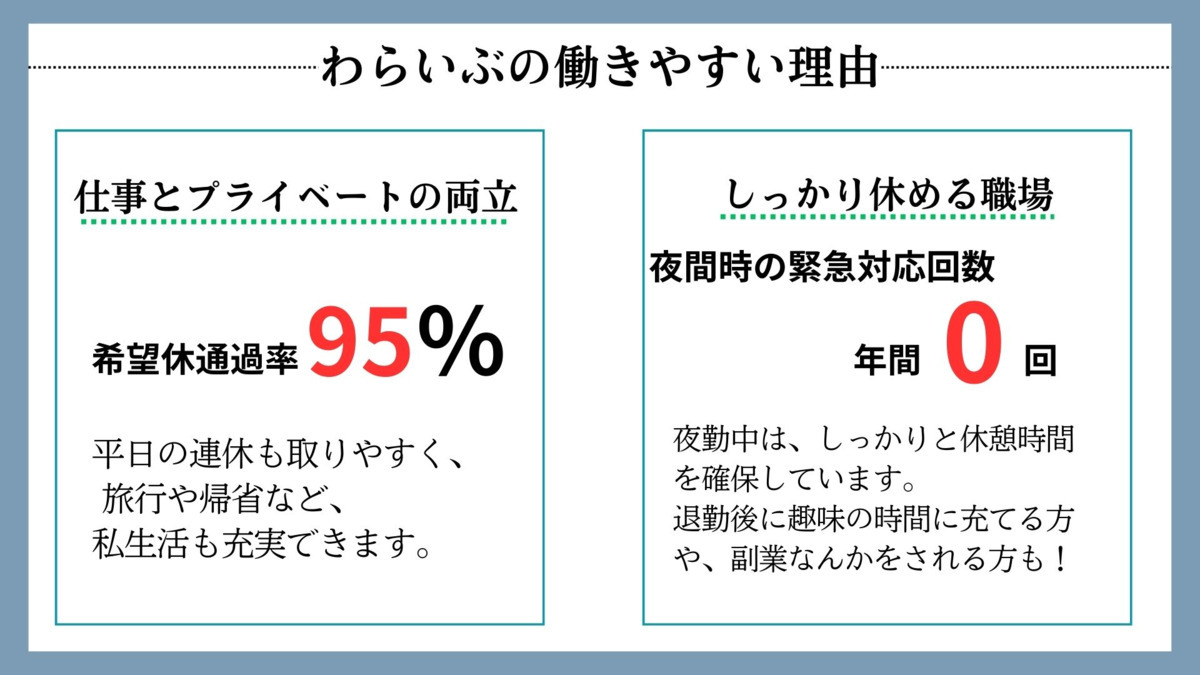 仮眠がとれ、次の日の疲労感は夜勤とは思えないほど!日中に「推し活」をしている方や副業をされている方もおります。