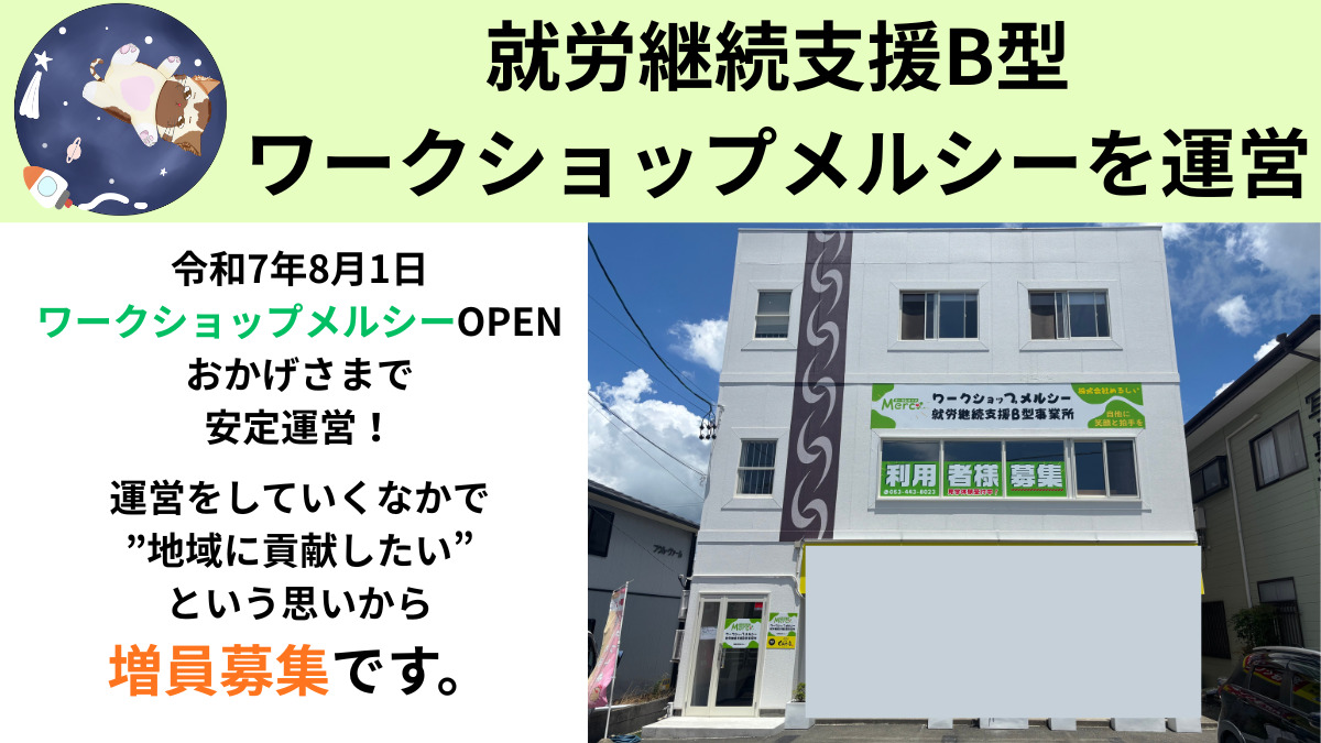 ワークショップメルシーを運営する株式会社めるしいでは、女性の役員登用実績があります。※男性の役員登用実績もあります。性別に関係なく活躍することができます。また、出産や育児で一度現場を離れたけど、お子様が成長し、正社員で働きたいという方も歓迎します。医療や福祉の経験や知識が活かせるのはもちろんですが、利用者様の支援をするにあたり、子育ての経験も活きてきます!