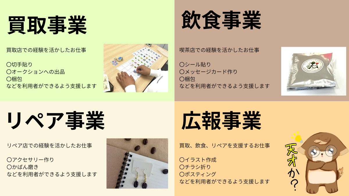 ・利用者様の支援業務 ・支援記録の作成 ・関係機関との面談・情報共有などのコミュニケーション ・お仕事や施設外就労先の開拓 ・各種事務処理 ・送迎 など ※対象者:18歳以上の精神障がいや知的障がい、発達障がいをお持ちの方 ※支援内容:データ入力・パソコンを使った仕事、ものづくり、接客・販売、清掃など。 弊社の関連会社と提携をして、事業所外での生産活動の提供も行っています。 従事すべき業務の変更:あり。適正・資格により管理者、サービス管理責任者、相談支援専門員への変更あり 就業場所の変更:あり。適正・資格により相談支援事業所(ワークショップメルシーより徒歩圏内)への変更あり