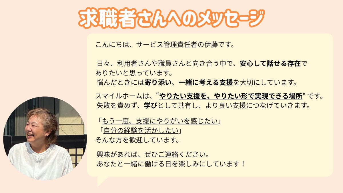 応募後、ジョブメドレーのメッセージ機能より、事業所に直接ご質問ください。求人内容についての質問は、ジョブメドレーからはお答えできかねます。