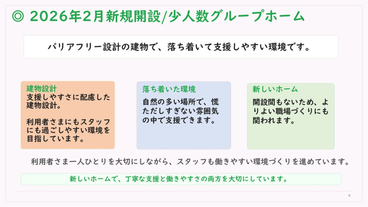 少人数のホームで、利用者さまに丁寧に関わる支援をしたい方をお待ちしています。募集内容
