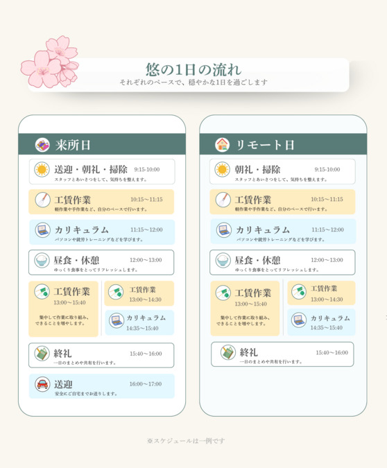 ・運転免許をお持ちの方は利用者さんの送迎 ・利用者さんと工賃作業やカリキュラムの時間のサポート ・利用を希望される方の対応 ・利用者さんのご家族対応 ※転勤なし ※業務の変更範囲:会社の定める業務