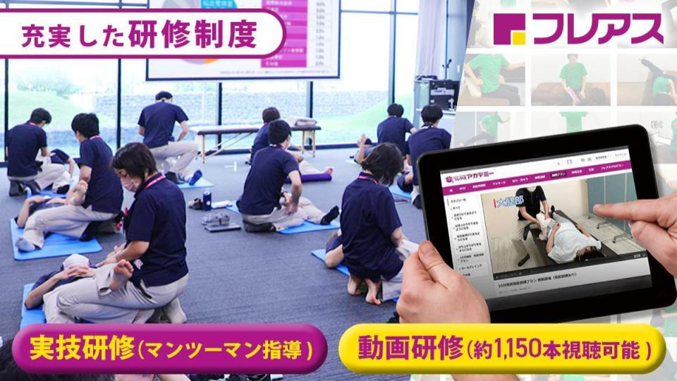 ■5日間の初任者研修🧑🏫 入社時に5日間の研修を実施! 未経験の方・ブランクのある方・同業から転職されてくる方、すべての方に実施しています。 フレアスの研修では、基本となる手技からリンパケア・機能訓練・リハビリといった研修を先輩施術者がマンツーマンで付き添います。 その他にも、主任研修、スキルチェック・知識チェックなどの育成研修があります。 また、研修の振り返りができる動画研修も600本タイトルご用意しております! ■OJT研修🧑🏫 技術主任のOJTを実施! 現場に一緒に同行しOJT研修を実施いたします。 一人立ちまでしっかり支援していきます! その他、事業所ごとに勉強会をしたり主任などのスキルアップ研修もあります♪
