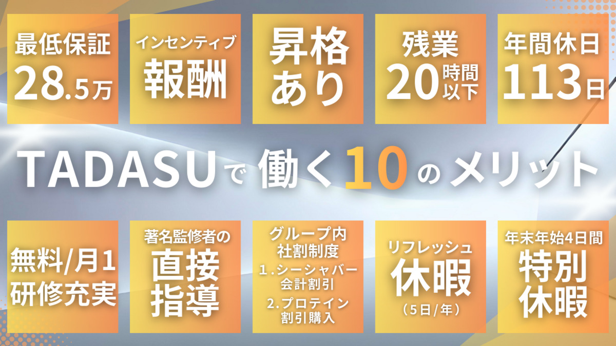 【シフト制】 ・勤務時間: 8:00~22:00 ※上記の勤務時間内より1日8時間 ・休憩時間: 1時間 ・月の残業時間:残業ほぼなし ◆入社からデビューまでの流れ 【1】初期研修(約3~4週間) - 技術研修(座学/実技) - 接遇研修(理念・考え方・トーク) - ケーススタディ実践 - クロージングスキル習得 - 業務オペレーション 【2】デビューテスト 【3】介入スタート - デビュー後3か月間のサポート(1on1/現場フィードバックなど) - 毎日の振り返り時間 - 定常サポート 【4】追加研修(月1回/技術・接遇) 【5】症例相談会(常時対応可能) \TADASU研修の特徴/ ◎約3~4週間の集中研修で、技術から接遇まで一通り学べます ◎自費診療・リピート獲得・経営ノウハウも習得可能 ◎1~3名/回の少人数制で、質問しやすい環境