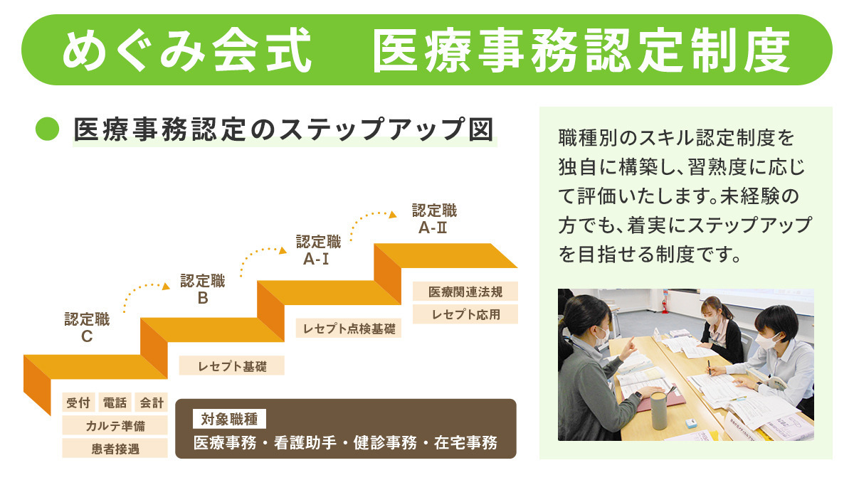◆めぐみ会式 医療事務 認定制度 スキル認定制度を独自に構築し、習熟度に応じて評価いたします。 未経験の方でも、着実にステップアップを目指せる制度です。 ◆医療分野専門講習受講・外部認定取得奨励制度 医療分野の専門的知識・技術向上を目的に、外部専門研修費の補助制度を制定し、参加を奨励しております。 専門性を磨く環境を整えています。