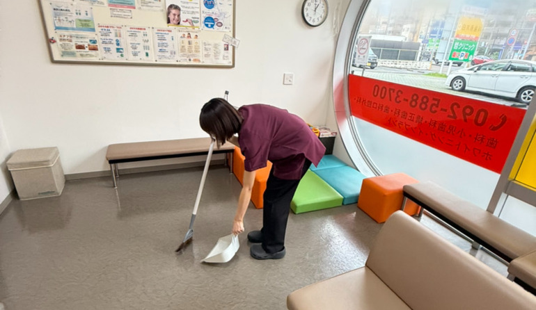 患者様を診療室にご案内したら、タイミングを見て、待合スペースの清掃チェックを行います。 毎朝の掃除に加え、このタイミングでもフロアやお手洗いをきれいな状態にすることで、患者様に快適な環境をお届けします。