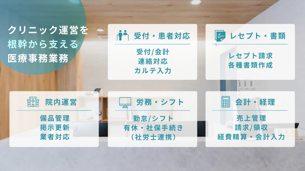 ①受付・患者対応業務 ・受付・会計業務 ・電話、メール、郵便、宅配物の対応・管理 ・電子カルテの入力、代行入力 ②レセプト業務・書類作成業務 ・レセプト請求業務 ・傷病手当金等の各種書類作成 ③院内運営・環境整備 ・備品管理(文具、トナー、用紙、診断書用紙など) ・院内掲示物の更新(休診案内、医師スケジュール) ・清掃業者・ビル管理会社とのやりとり ④労務・シフト管理 ・勤怠チェック(打刻漏れ・修正) ・シフト管理(医師・看護師・心理士・事務) ・有給休暇管理 ・社会保険・雇用保険の手続き(社労士連携) ⑤会計・経理関連業務 ・日次売上チェック(レセプト・自費) ・請求書・領収書管理 ・経費精算 ・クレジットカード明細チェック ・会計ソフト入力(or 会計事務所連携) ・家賃・リース・固定費の管理 その他クリニック運営のサポート 従事すべき業務の変更の範囲:なし 就業の場所の変更の範囲:なし