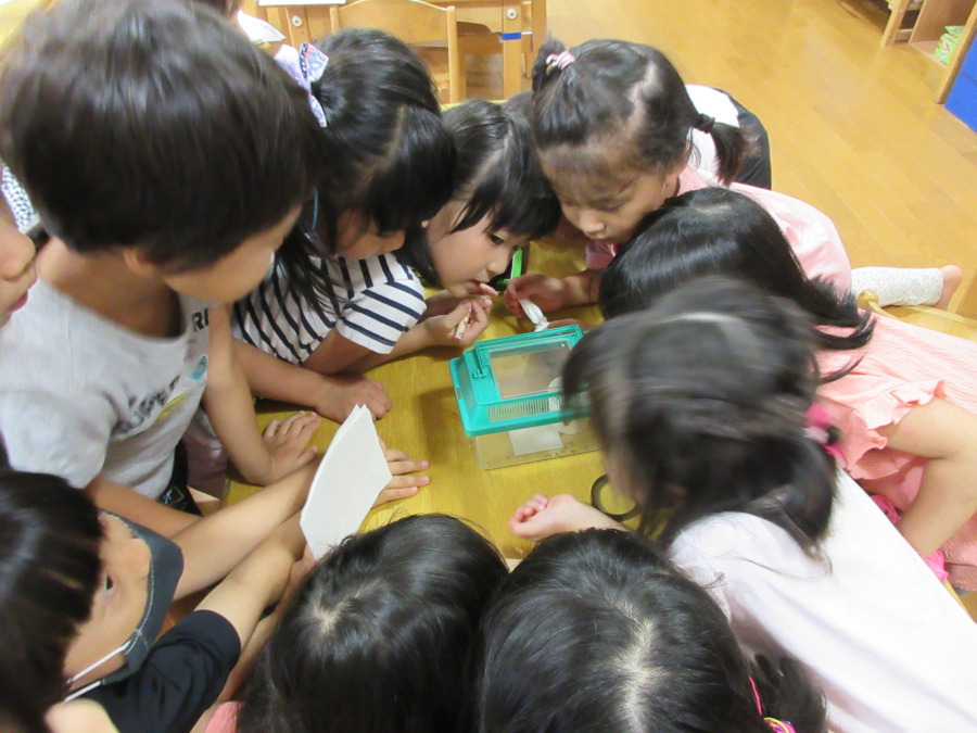 材料は原則として国産を使用しています。科学調味料は使用せず食材の持ち味を活かせるよう、天然だしをとって美味しく安全な食事の提供を行っています。また、梅干しやお味噌づくり、クッキングも行っています。食に興味をもち健康に育ってほしいから、お米屋さん八百屋さん魚屋さんなどを招き、実際に食材に触れて学ぶ食育にも取り組んでいます。栄養士とともに「食べる」を通して「生きる」を考える子どもを育てます。